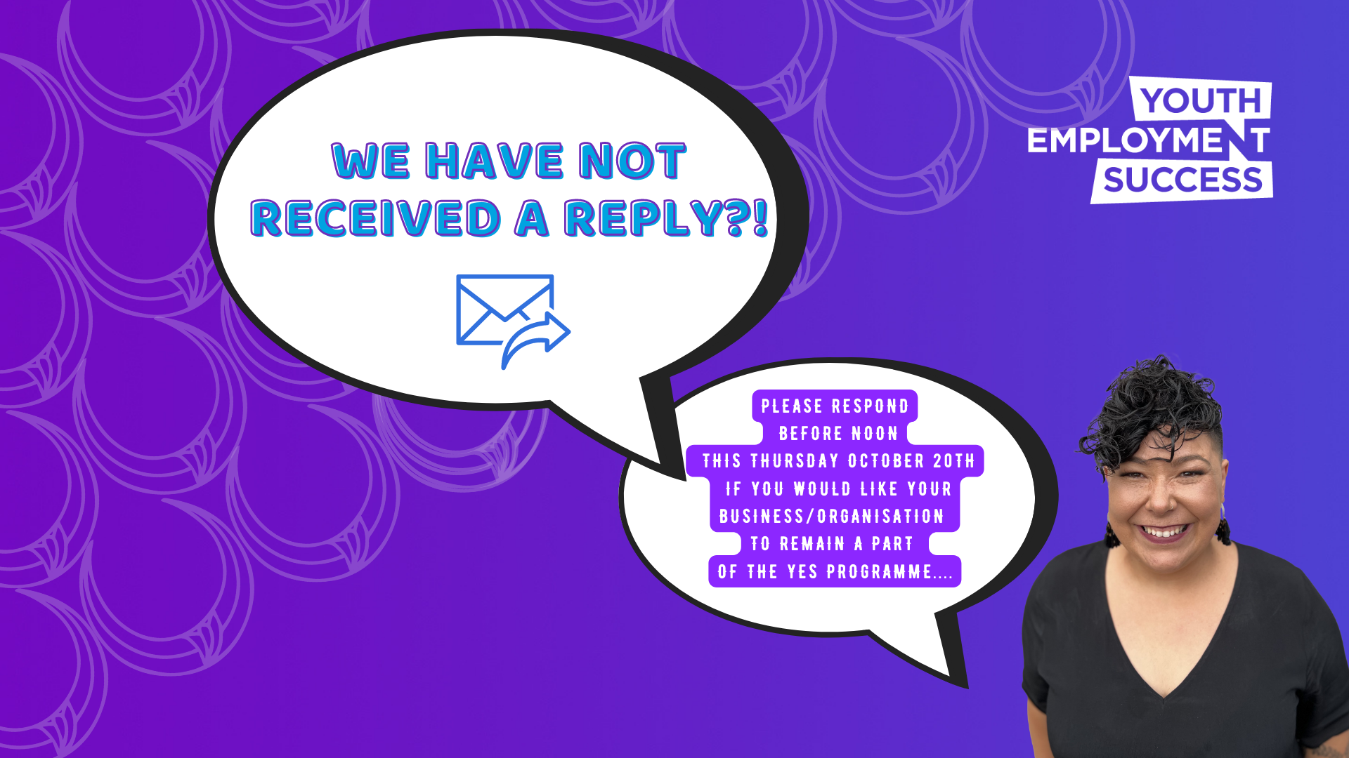If, for some reason, you have missed our previous communications, but you remain committed to supporting the YES programme and would like to continue offering opportunities, please reply to this email by no later than 12.00 pm this Thursday, October 20th 2022, "YES! I'd like to continue".